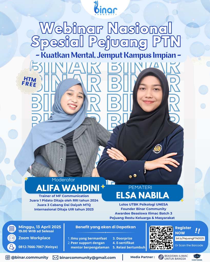 Webinar ini dipersembahkan oleh Elsa Nabila (Awardee Beasiswa iLiMAC Batch 3) dan ditujukan khusus untuk membantu kamu mempersiapkan diri secara mental menghadapi perjuangan masuk PTN.